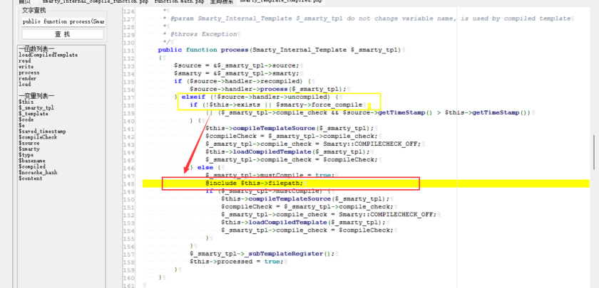 这里的这个 Payload 所使用的正是我们一开始所说的类的静态方法,是对调用类中静态方法的一种绕过。静态方法中的参数不再使用 self 标签,而是使用了 smarty.template_object->compiled->filepath 两处调用。
