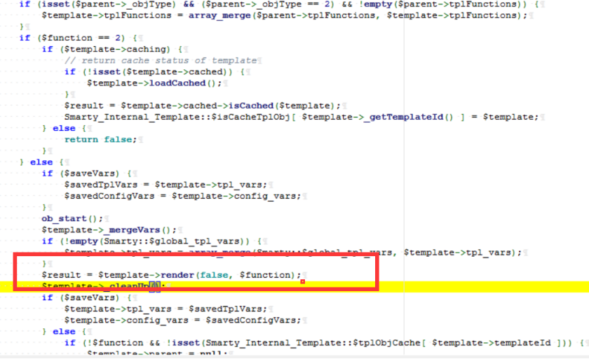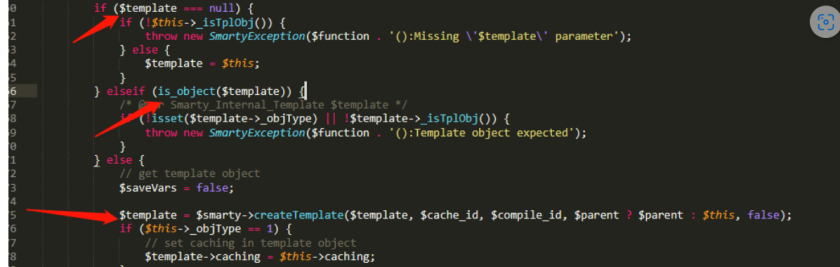 我们可以发现template在这段代码中,直接进入elseif语句,其结果是使用了createTemplate方法,并且将template的值进行了覆盖,然后我们对createTemplate方法进行追综,可以发现template最后被赋值成一个Smarty_Internal_Template的对象,也正如createtemplate的字面意思