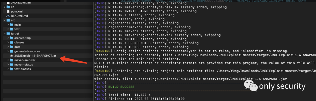 取出base64编码,替换JNDIExploit工具里面的codeClass参数,然后对JNDIExploit工具进行编译,获得jar包