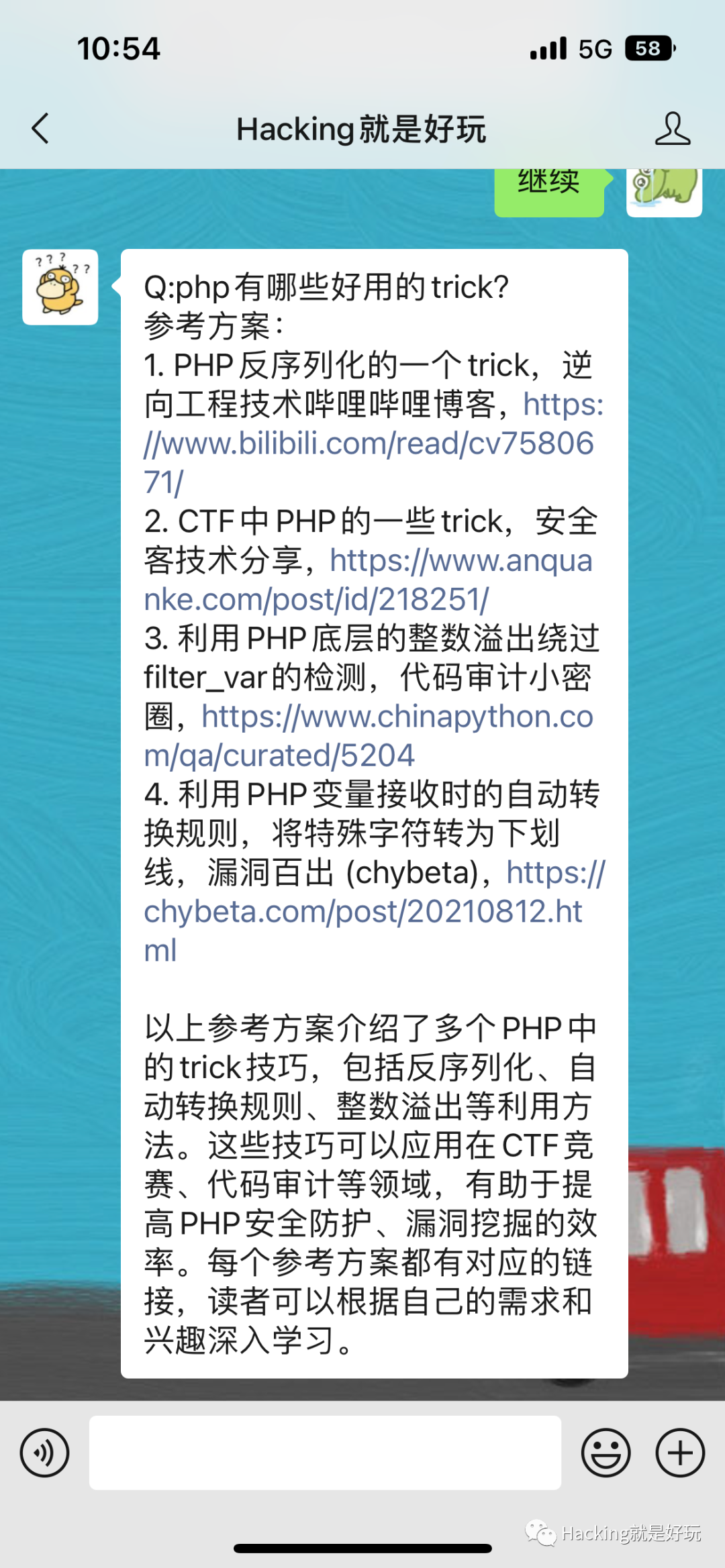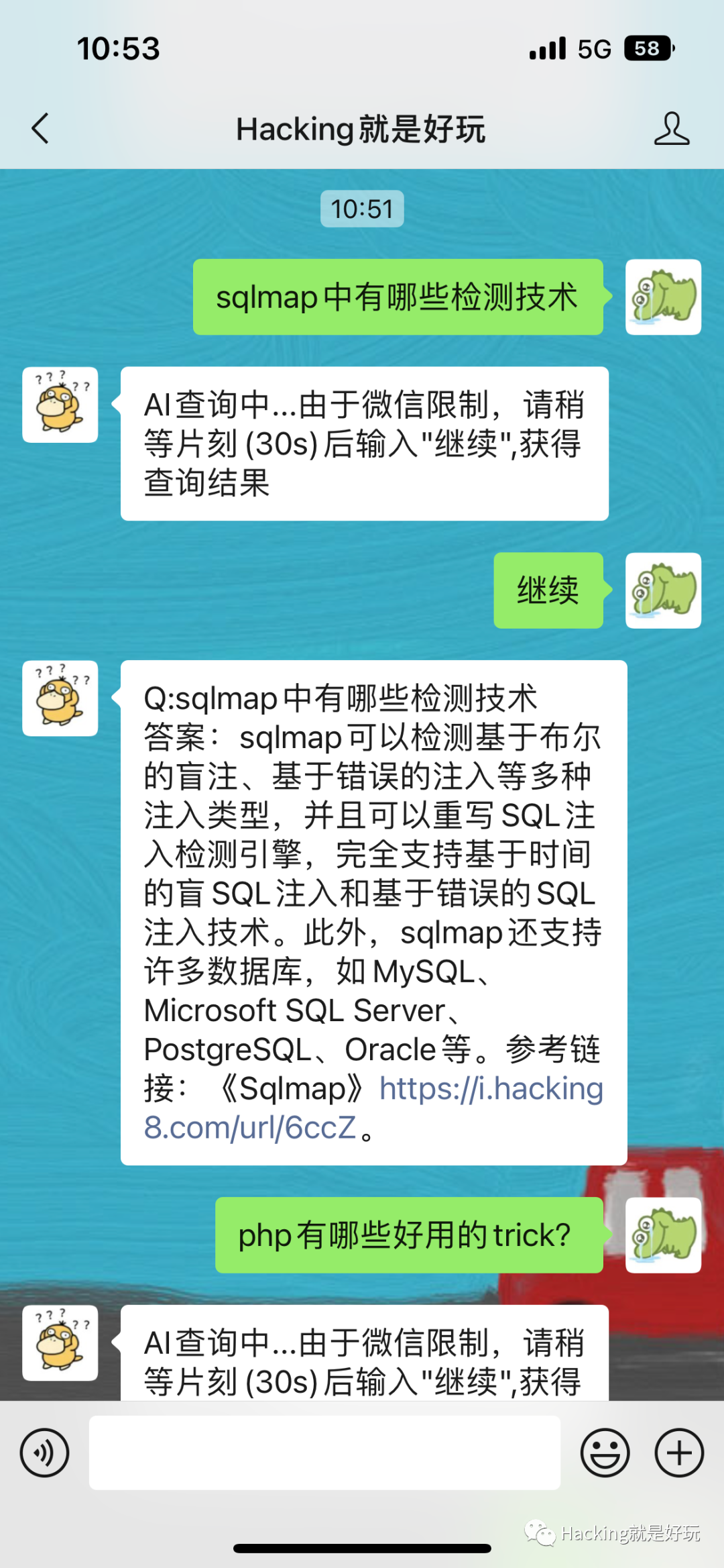 根据之前的文章ChatGPT:和黑客知识库聊天将Hacking8信息流的数据做了整合,可以直接提问并获得答案,使用方式如图。直接向公众号问问题即可。目前还是demo性质,还不太稳定,多试试。有一些缺点