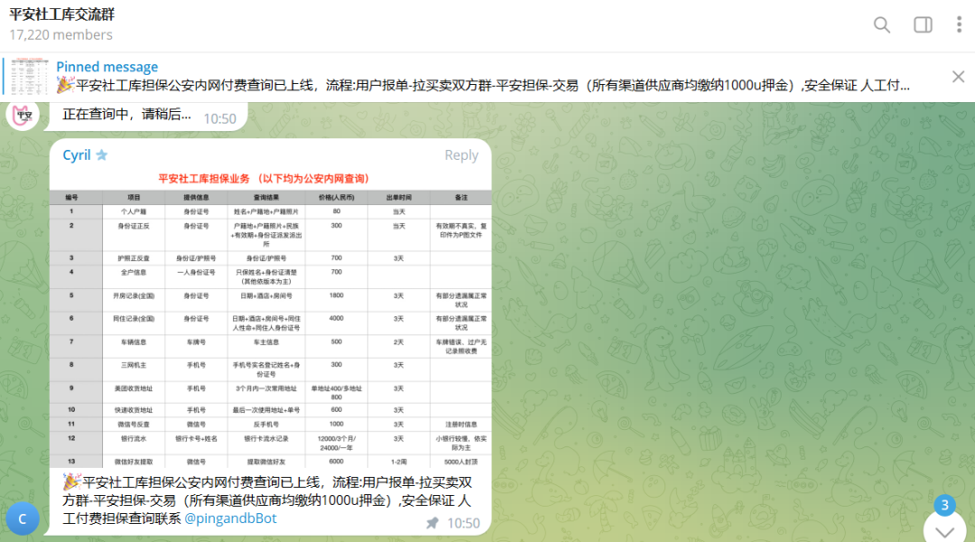 在某交流群中,一个大幅的广告被赫然置顶,明码标价每一条隐私