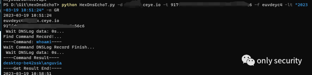 python3 HexDnsEchoT.py -d yourceye.ceye.io -t ceyetoken -f filterstr -lt "上次命令执行的时间" -m GR