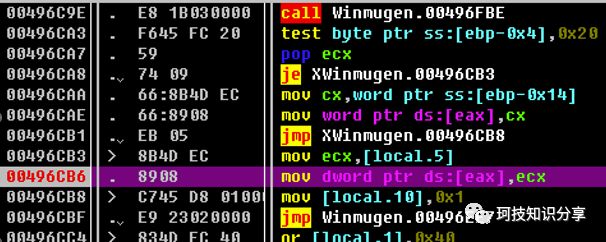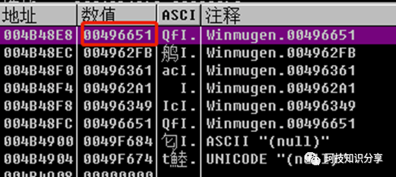 我们来尝试追踪下漏洞代码,由于已经知道了会写0x4b4048,可以下内存写入的断点,可以发现能断在0x496CB6|mov dword ptr ds:[eax],ecx