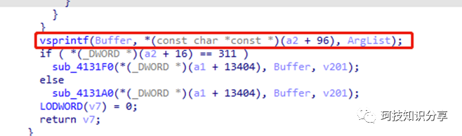 可以发现,上面的call 004967DF就是call _vsprintf,那么漏洞代码发生在这里。a2和ArgList均可控制,这在pwn中是一个非常明显的字符串格式化漏洞,通过%n可以实现任意地址写。