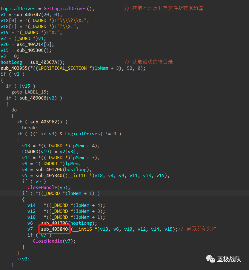 0x24 sub_401A76 中调用GetLogicalDrives函数遍历本地驱动及共享文件驱动