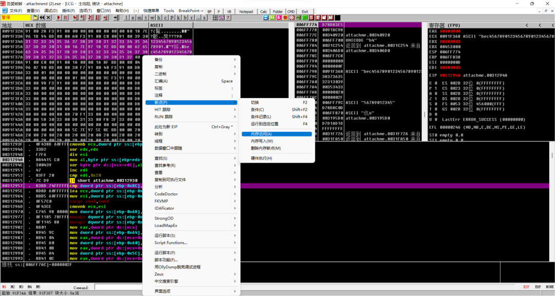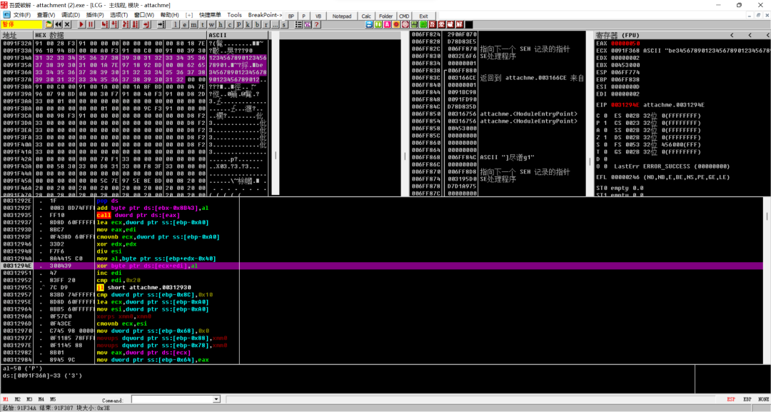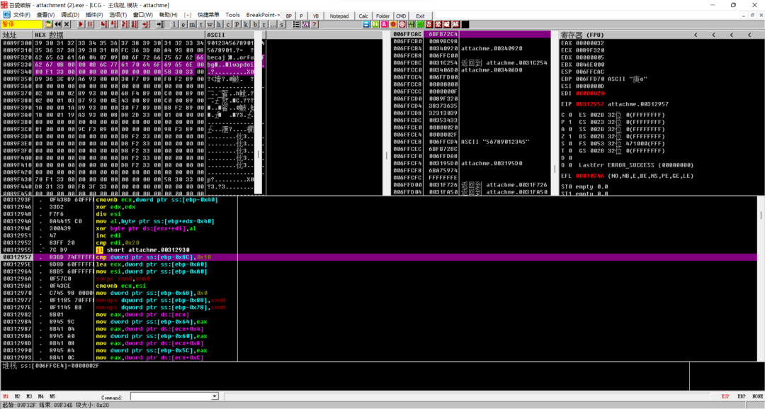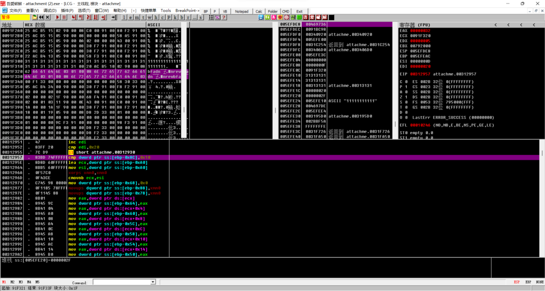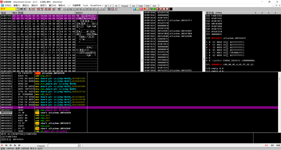 这个异或的循环会进行32次,为了方便操作,我们下一个内存断点,并在数据窗口里跟随地址。这样在后面我们可以看到它异或之后的结果之后F9,程序运行暂停,可以在内存中看到第一次数据
