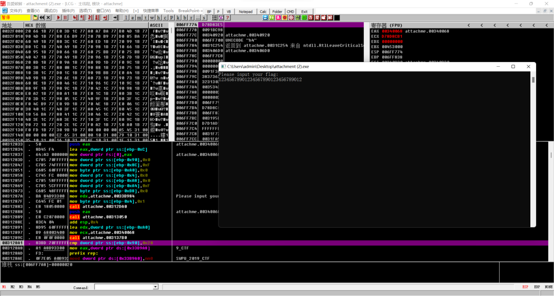一直F8到输入的部分观察内容,cmp是比较,edp-0x90是要输入内容的地址,0x20=32,所以要输入32位