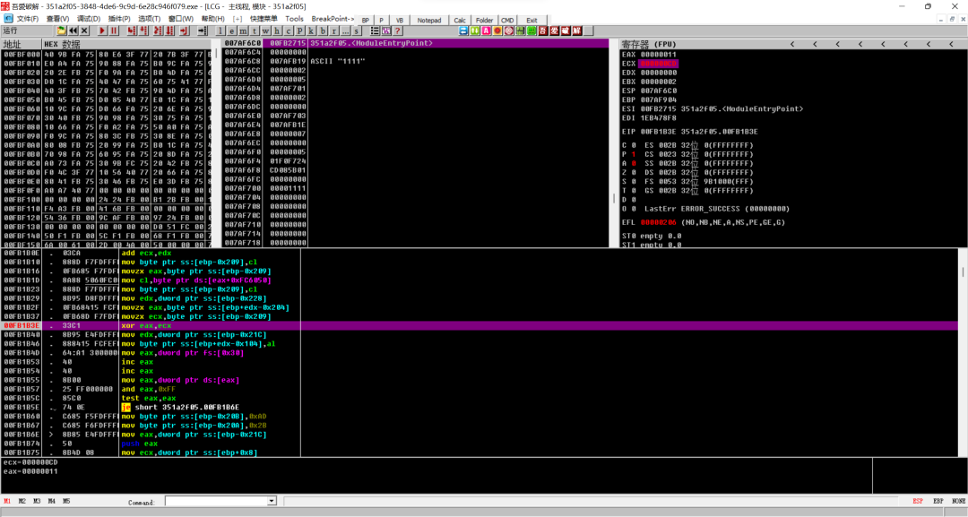 在xor处下断点,开始调试,输入正确的用户名后随便输点什么当密码。这时ecx的值变化,接着f9记录ecx的所有值