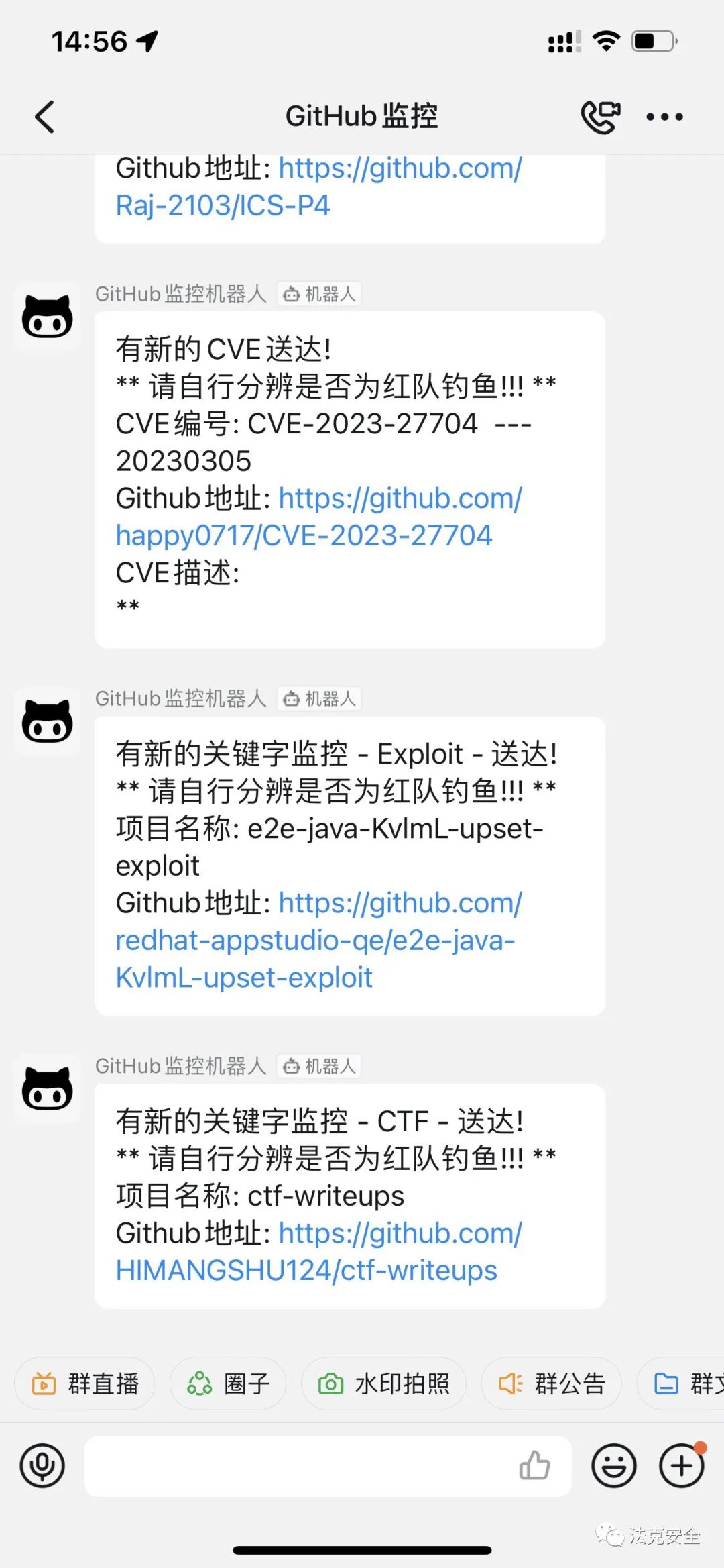 闲来无事,正好服务器放着没用,就想着把他利用起来,给大家搭建了一个GitHub监控机器人,能够第一时间获取到工具更新,CVE更新,相关关键词监控等只要github更新了设置的关键词或者出现新的CVE等,机器人都会及时的推送到钉钉群里。https://qr.dingtalk.com/action/joingroup?code=v1,k1,yrhX6z5fTONQu3bsubETkU6/dT8zxORf2PaHMUvnf4o=&_dt_no_comment=1&origin=11注意事项:由于考虑到很多师傅还是学生或者已经上班了的,机器人凌晨将不会进行推送,希望各位师傅们互相理解一下。