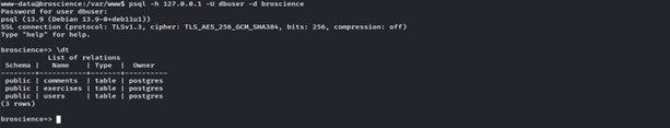 psql -h 127.0.0.1 -U dbuser -d broscience查看user数据表,发现存在5行数据,且存在密码字段,其中包括bill用户。