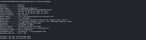 hashcat 13edad4932da9dbb57d9cd15b66ed104:NaCl /usr/share/wordlists/rockyou.txt -m 20# 凭据信息bill:iluvhorsesandgym