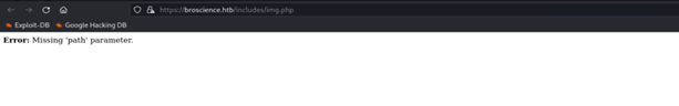 在https://broscience.htb/includes/img.php页面提示缺少“path”参数。