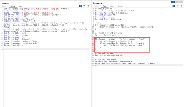 通过https://broscience.htb/includes/img.php?path=..%252fincludes/img.php读取到img.php源代码,源代码中对请求参数中的../,etc/passwd,.ssh做了黑名单限制。