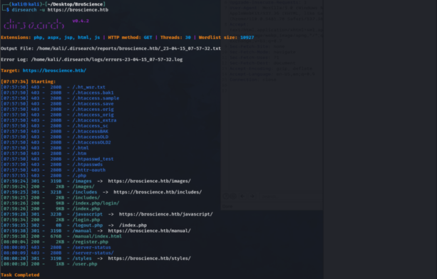 使用dirsearch对https://broscience.htb/进行目录扫描结果如下,除刚研究的login.php,register.php外,比较有价值的就是https://broscience.htb/includes/,该目录内包含一些文件。