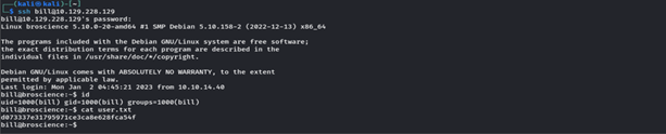 在端口嗅探中得知靶场开放22端口,使用bill账户进行ssh登录,成功获取到bill账户权限,在bill账户桌面获得user.txt。