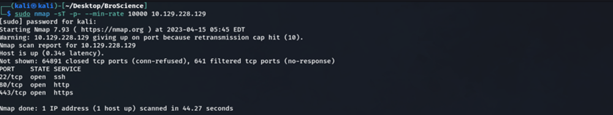 sudo nmap -sT -p- --min-rate 10000 10.129.228.129sudo nmap -sV -sC -p 22,80,443 10.129.228.129访问80端口,页面跳转至https://broscience.htb/域名访问。