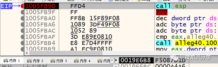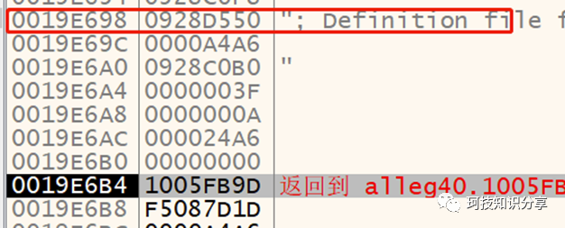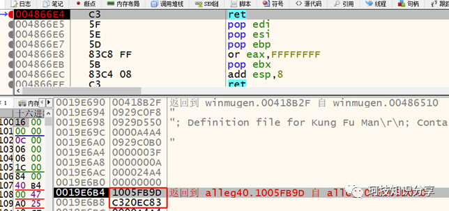 可以看得出来,此时已经完成溢出,422438是栈溢出中覆盖了ret的地址,和之前Reboot用过的403246一样是个add esp;ret。看栈可以看得出来,接下来会跳到ALLEG40.DLL上的10078CEF上。跟进之后发现就是jmp esp。