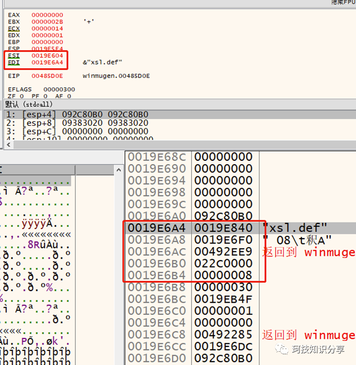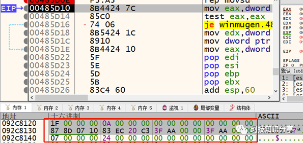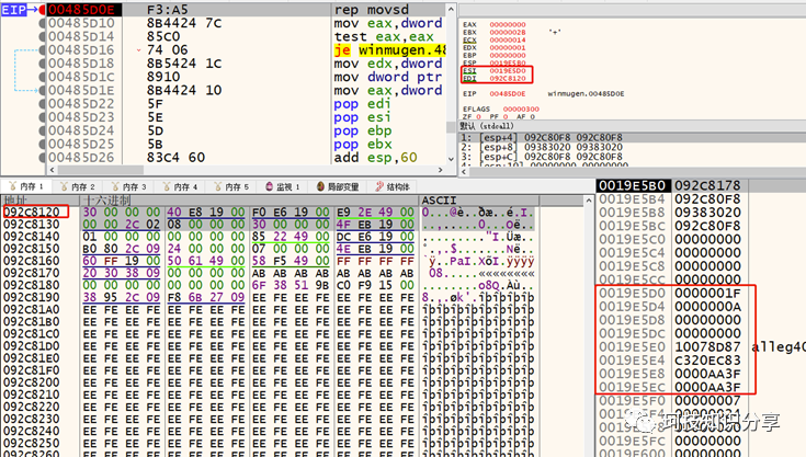 485D0E rep movsd(qmemcpy)为什么会导致栈溢出呢?rep movsd的意思很简单,就是从ESI复制内容到EDI上去(复制ECX个字节)。在发生栈溢出前,也有两次正常的rep movsd,我们可以看内存变化。
