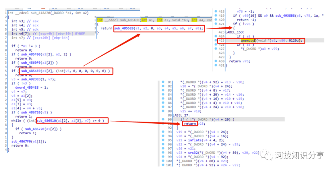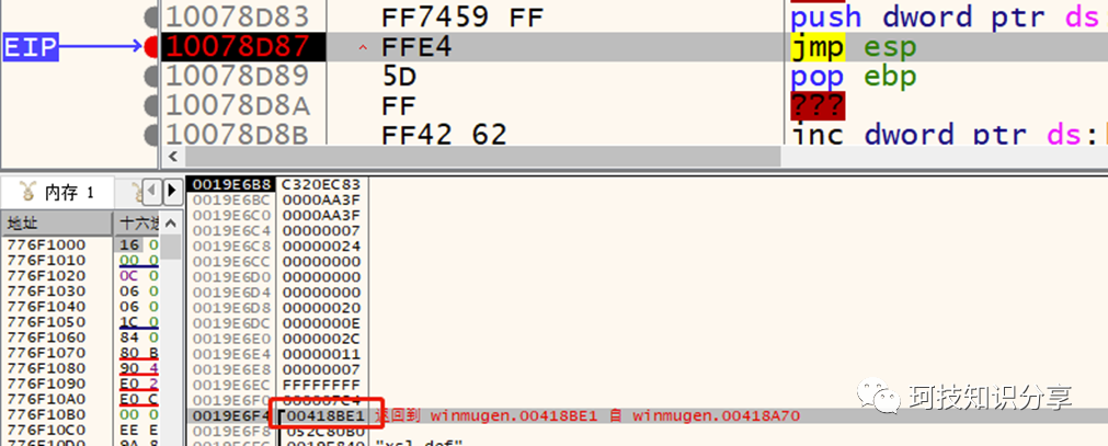 sub_40CF80()——0x40D8F9 call sub_418B90sub_418B90()——0x418A70 call sub_418A70sub_418A70()——0x418ACE call sub_4854E0sub_4854E0()——0x48550A call sub_485520sub_485520()——0x485D0E rep movsd(即qmemcpy,发生栈溢出)sub_418A70()——0x418B2A call sub_486510sub_486510()——0x4866E4 ret(跳转到jmp esp)