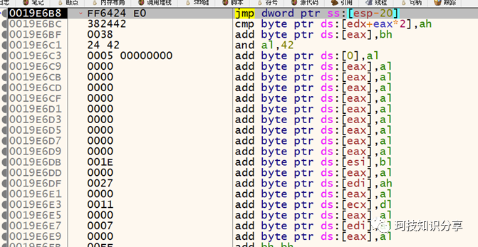 但这样最终还是无法执行shellcode,动态调试一下,很容易发现我们sub esp,0x20;ret这一步错了,跳到其他地方去了。