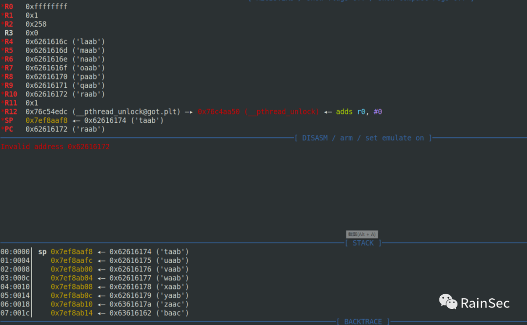 因为开启了NX保护所以rop构造system(cmd),在arm架构下控制r0~r3的gadgets很少,但是在程序中调用system函数的附近找到如下指令: