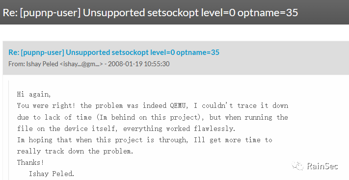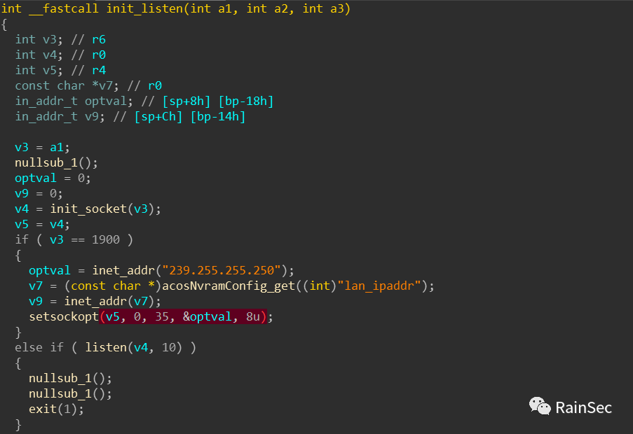 程序在main函数中调用了daemon进入后台,所以不方便直接gdb调试,因此为了后面分析这里需要NOP掉;然后就是直接运行发现后面立马exit(0)。nop掉daemon后进去调试发现在调用setsockopt(v5, 0, 35, &optval, 8u)加入多播地址出错: