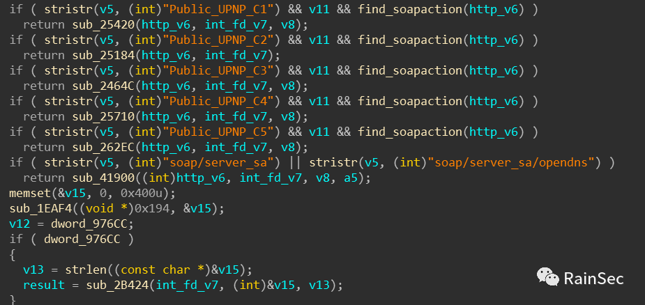 前面几个Public_UPNP_Cx是有对应XML描述文件的,但是soap/server_sa和soap/server_sa/opendns这两个URL是没有任何描述文件的,所以估计在sub_41900中实现了内部API,经过动调分析其函数签名为:sub_41900(int http, int int_fd, in_addr_t in_addr, int pass),http指向客户发送的http数据,int_fd则是交互socket,in_addr为客户ip,pass暂未分析出来。下面分析该函数中重点部分