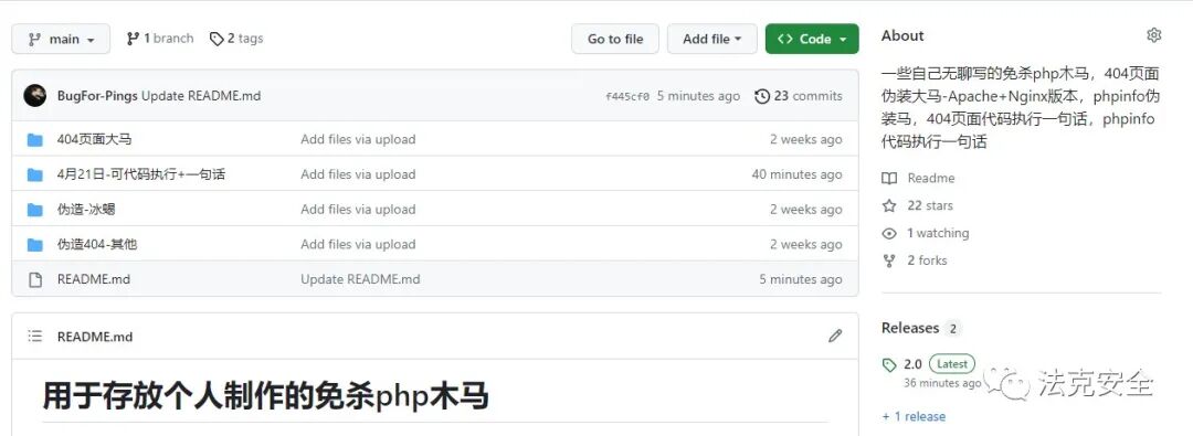 仓库里放的都是一些自己无聊写的免杀php木马,404页面伪装大马-Apache+Nginx版本,phpinfo伪装马,404页面小马。