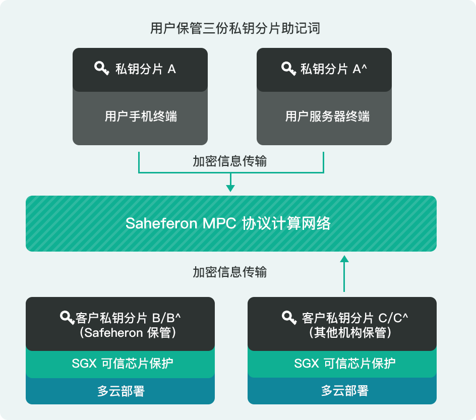 上文提到,Safeheron 底层采用 3/3 MPC 门限签名,其中 2 个私钥分片由 Safeheron 和可信第三方管理和存储,另外一个私钥分片在客户本地设备中生成和存储。云端的两个私钥分片在可信执行环境(Trusted Execution Environment,简称 TEE)中生成,且在 TEE 环境中加密后存储在数据库中。为了保证私钥分片数据的高持久性,我们采用多云多地域的方式对云端数据进行备份,以防止云端私钥分片存储存在单点风险,从而避免云端私钥分片丢失。
