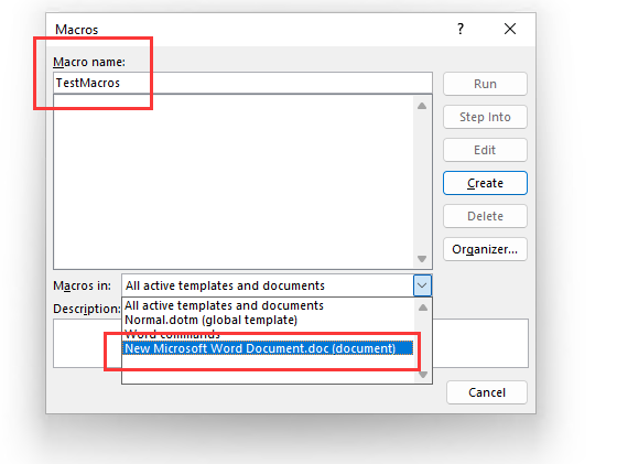 然后在弹出的窗口里给宏任意取个名字。并在Macros in里选择document,并Create创建。