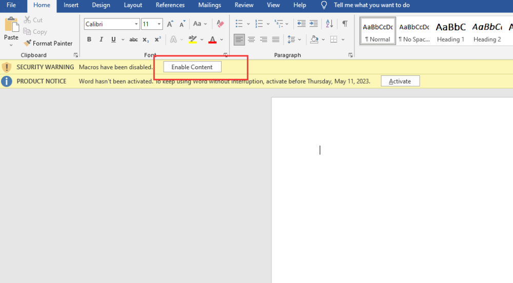 然后我们再进行保存,并重新打开文档。重新打开文档后,可以开单一条安全警告,表示宏已经被禁用。需要我们点击Enable Content来启用内容。