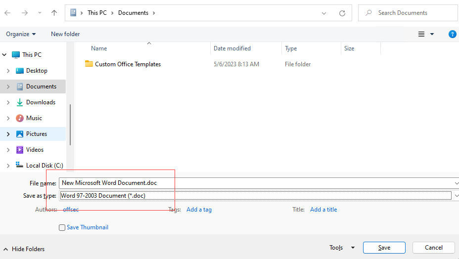 首先在Attack user端创建一个空白的Word文档,并保存为doc格式。因为新的docx格式文档无法在不附加包含模板的情况下保存宏。也就是说,docx文件可以运行宏,但不能嵌入或保存宏。