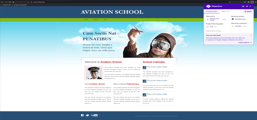 访问http://school.flight.htb/页面,并观察响应包,获取Apache、OpenSSL、PHP版本信息。该页面为网站模板页面,仅存在“Home”、“About Us”、“Blog”页面。