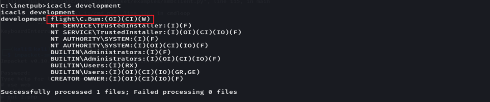 发现flight/C.Bum账户对源码文件夹有写权限,而我们现在就是C.Bum权限。可以在源码文件夹下写入恶意文件。