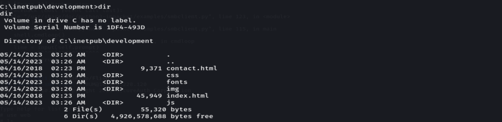 impacket-smbclient [email protected]10.129.228.120Impacket v0.10.0 - Copyright 2022 SecureAuth CorporationPassword:Type help for list of commands# use web# lsdrw-rw-rw- 0 Sun May 14 05:35:38 2023 .drw-rw-rw- 0 Sun May 14 05:35:38 2023 ..drw-rw-rw- 0 Sun May 14 05:35:17 2023 flight.htbdrw-rw-rw- 0 Sun May 14 05:35:43 2023 school.flight.htb# cd flight.htb# lsdrw-rw-rw- 0 Sun May 14 05:35:22 2023 .drw-rw-rw- 0 Sun May 14 05:35:22 2023 ..drw-rw-rw- 0 Sun May 14 05:35:17 2023 cssdrw-rw-rw- 0 Sun May 14 05:35:22 2023 images-rw-rw-rw- 7069 Thu Sep 22 16:17:00 2022 index.htmldrw-rw-rw- 0 Sun May 14 05:35:32 2023 js