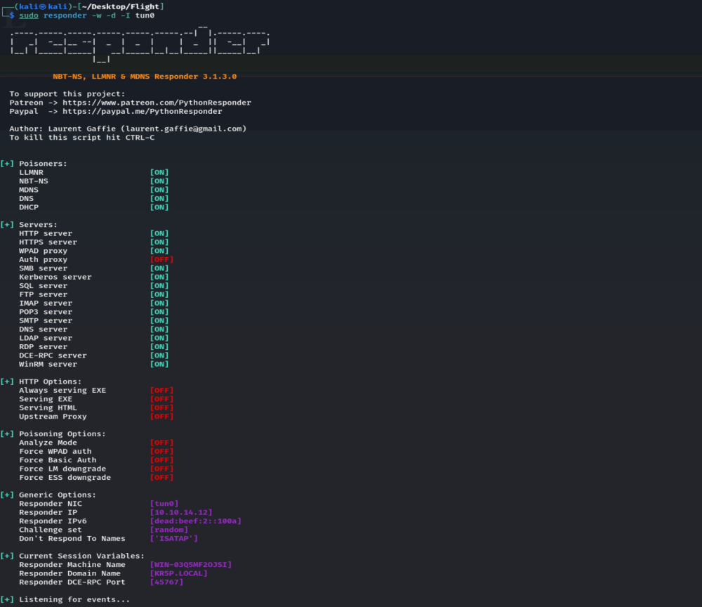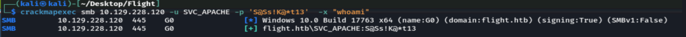 [SMB] NTLMv2-SSP Client : 10.129.228.120[SMB] NTLMv2-SSP Username : flight\svc_apache[SMB] NTLMv2-SSP Hash : svc_apache::flight:1df0bf37ef343206:43505A2E55DA656BA52074C8FEC17A6F:010100000000000080EE8EA25985D9013E735AC9C1F4B0B700000000020008004B0052003500500001001E00570049004E002D0030003300510035004D00460032004F004A005300490004003400570049004E002D0030003300510035004D00460032004F004A00530049002E004B005200350050002E004C004F00430041004C00030014004B005200350050002E004C004F00430041004C00050014004B005200350050002E004C004F00430041004C000700080080EE8EA25985D901060004000200000008003000300000000000000000000000003000007E3DAE55A09F5F5D99003DCC3A177F13ACD73504350575881BA91E117539AB700A001000000000000000000000000000000000000900200063006900660073002F00310030002E00310030002E00310034002E00310032000000000000000000