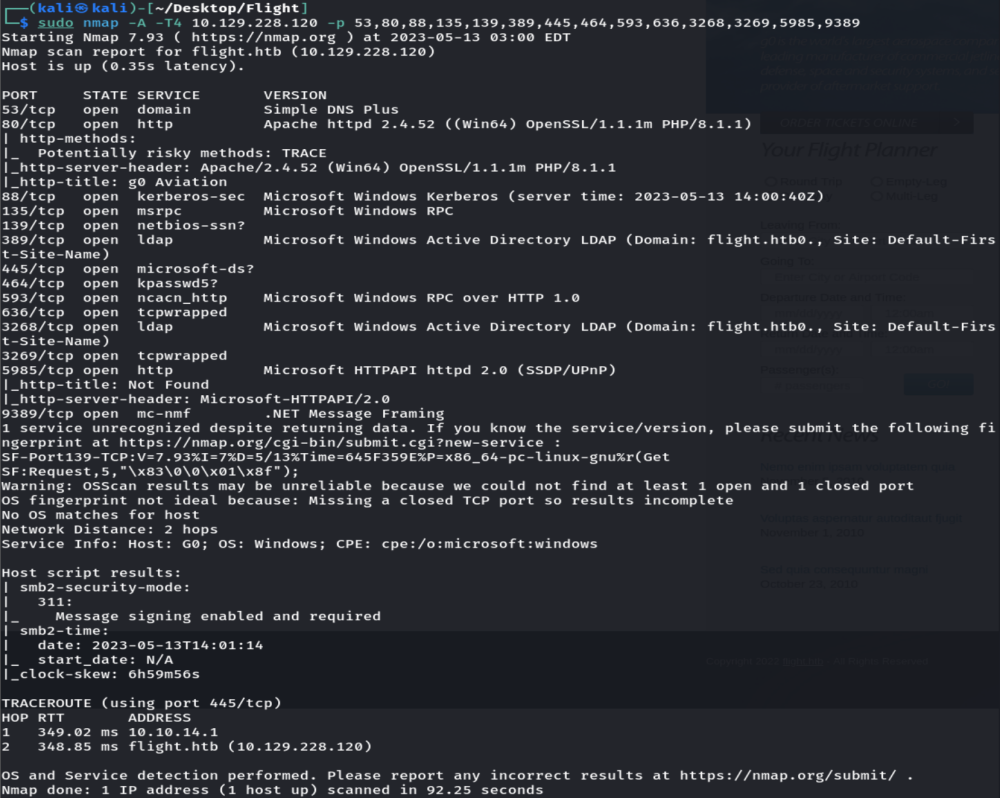 sudo nmap -sT -p- --min-rate 10000 10.129.228.120继续使用nmap对开放的端口进行深入扫描,由于“-sS -sC”未能获取更多信息,所以改用了“-A -T4”来进行嗅探。在扫描结果中找到“flight.htb”域名。