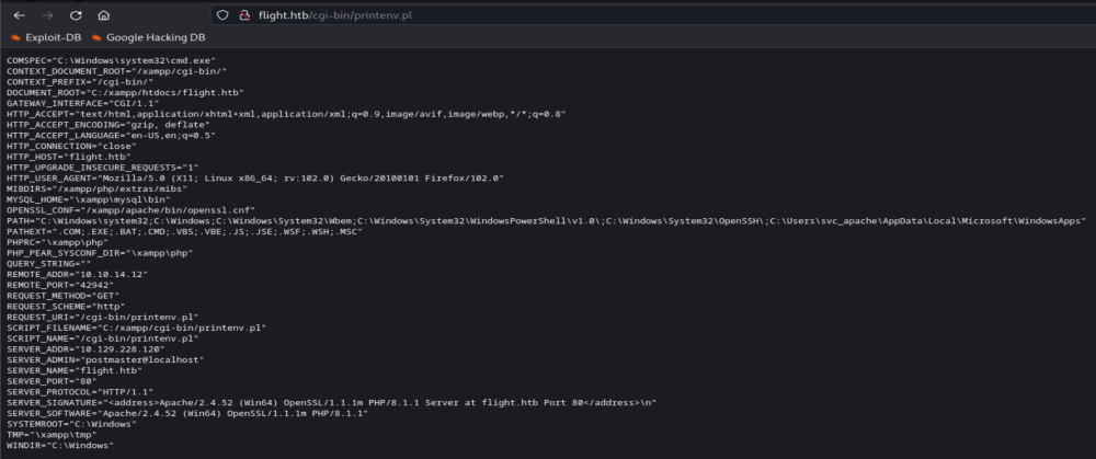 dirsearch -u http://flight.htb/ -x 403,301,503仅在http://flight.htb/cgi-bin/printenv.pl页面发现存在有CGI组件(https://book.hacktricks.xyz/network-services-pentesting/pentesting-web/cgi),除此外暂未发现有用信息。